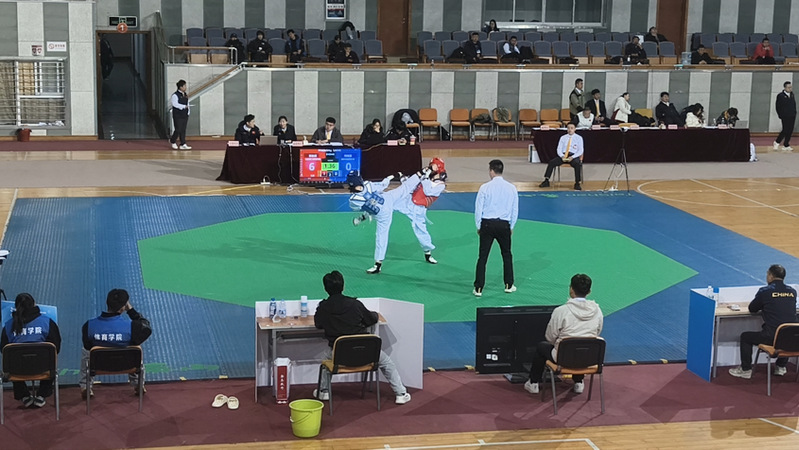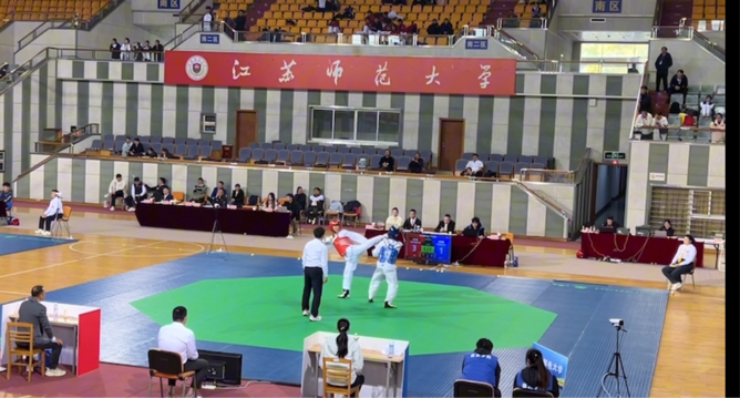 2025年11月5日至10日,江苏省第二十一届运动会高校部跆拳道比赛在江苏师范大学泉山校区体育馆热血开赛。全省69所高校队伍参赛,五百多名精锐齐聚一堂,参赛人数为历届之最,竞争更趋激烈。我校跆拳道队在领队张洪兵老师及教练姚焱兵、蒋向华老师的带领下,最终斩获甲B组男子80kg比赛铜牌、甲B组女子72kg第五名,朱扬宜同学获得“优秀运动员”称号,队伍再度荣膺“体育道德风尚奖运动队”。向众人展现了矢志不移、坚韧不拔的体育精神。