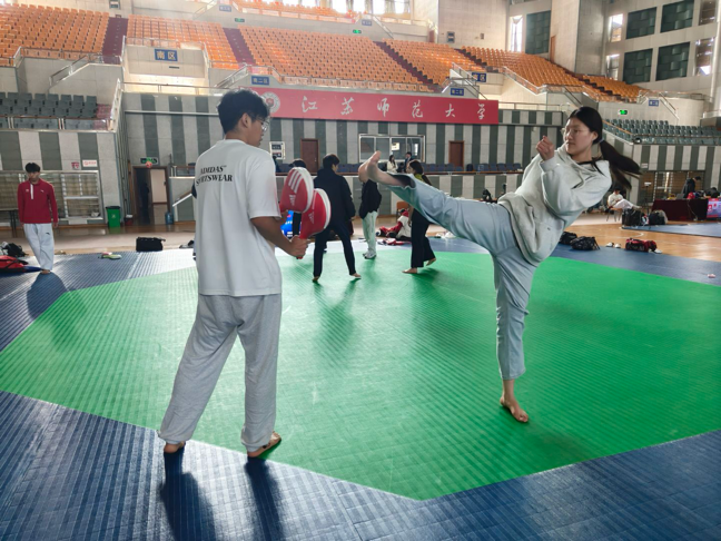 每周固定训练中,两校区队员齐聚专业场馆,在升级后的地垫、靶具与护具旁反复打磨横踢、侧踹等技法,蛙跳、核心力量训练等体能项目上相互鼓励、比拼进步。即便课业繁忙,也无人缺席训练,韧带拉伸的酸胀、肌肉训练的疲惫,都在队员的并肩坚持中化作突破自我的动力。